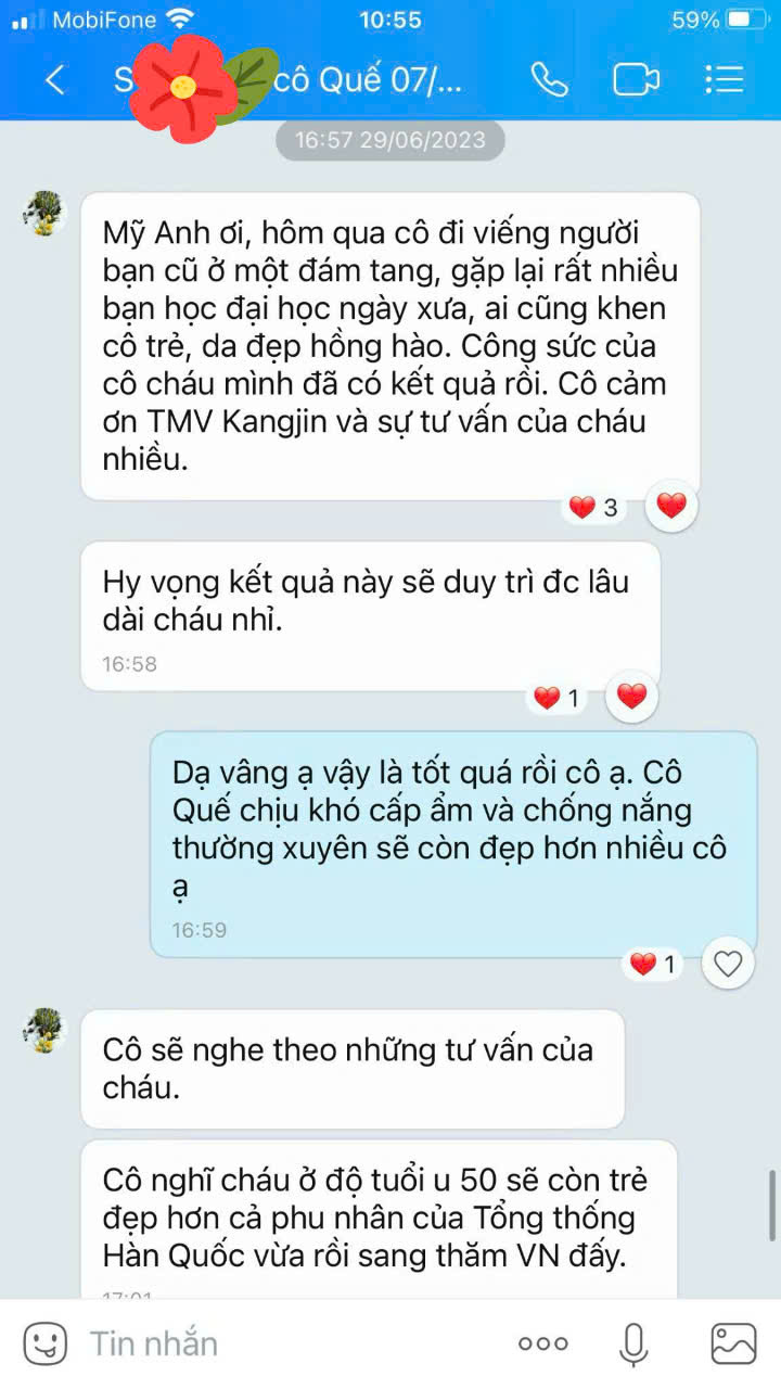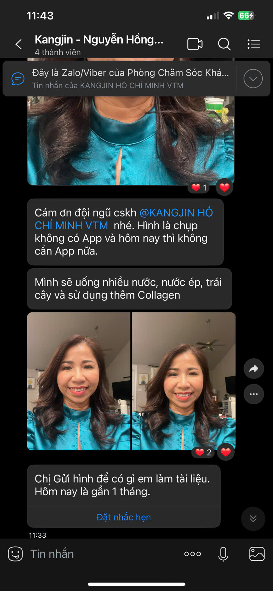 “Biết ơn toàn thể ekip bác sĩ, nhân viên tư vấn và điều dưỡng tại KangJin đã giúp chị có thêm cuộc đời mới. Thực sự tay nghề bác sĩ quá tốt, lúc làm chị không thấy cảm giác đau rát gì cả, làm xong chị cũng không ngờ làn da được cải thiện nhiều như này. Giờ chị tự thấy bản thân trẻ ra cả chục tuổi ấy, cảm ơn VTM KangJin rất nhiều”.