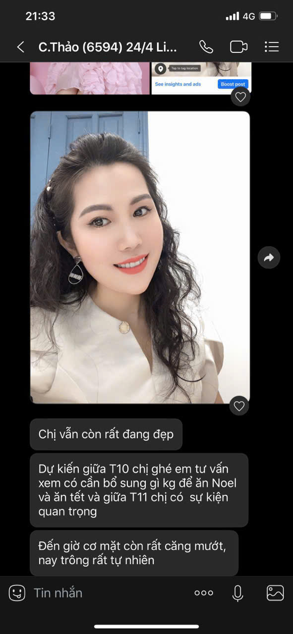 “Chị không ngờ thẩm mỹ ở Việt Nam lại phát triển tiên tiến như vậy, giá cả rẻ hơn so với nước ngoài nhưng hiệu quả thì vượt trội hơn rất nhiều. Chị thấy da khá là căng, mướt và hồng hào. Tình trạng bao xơ đã được cải thiện rõ rệt, nếp nhăn hay rãnh cười gần như biến mất, túi mỡ bên má cũng không còn nữa luôn em à”